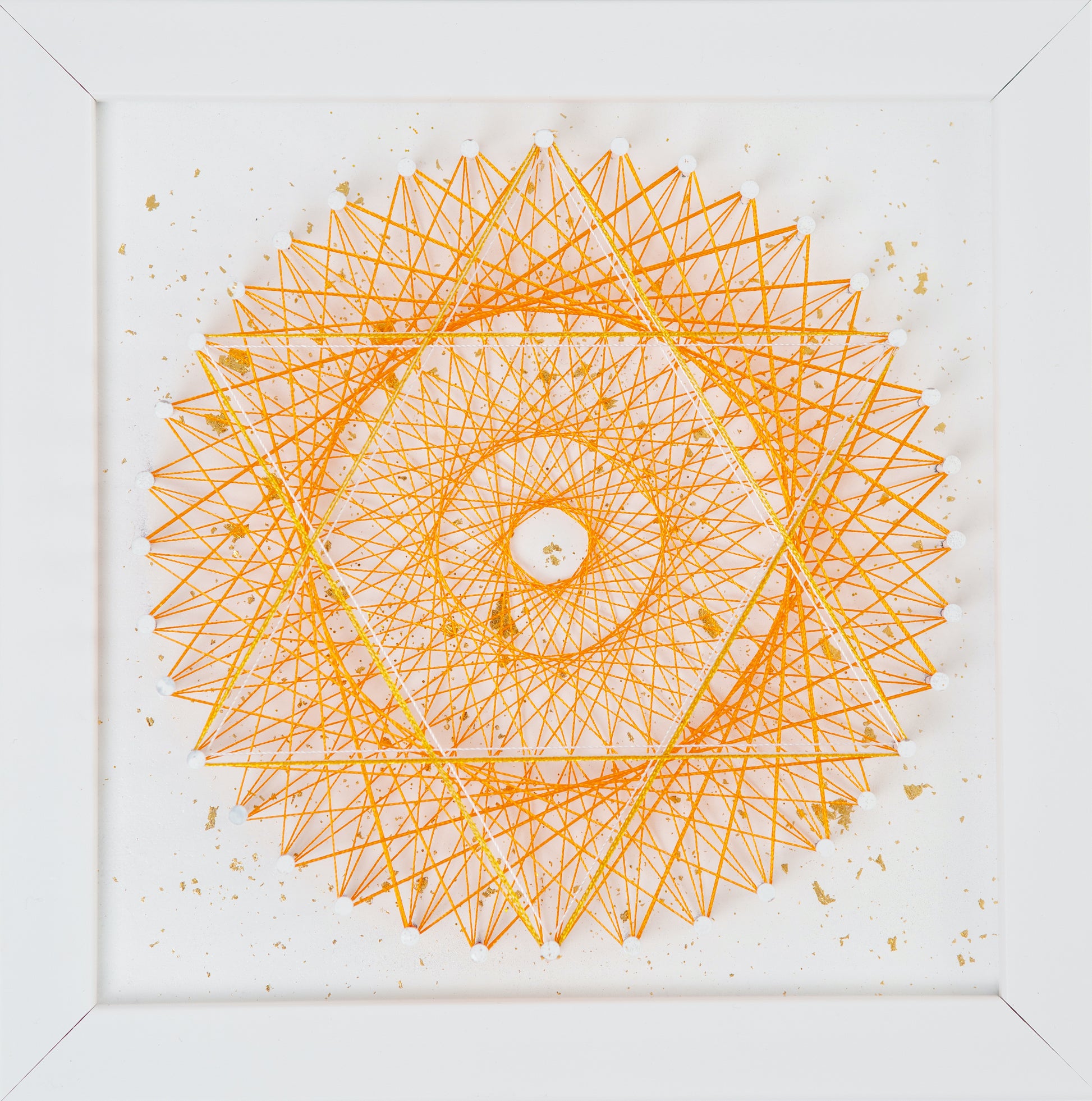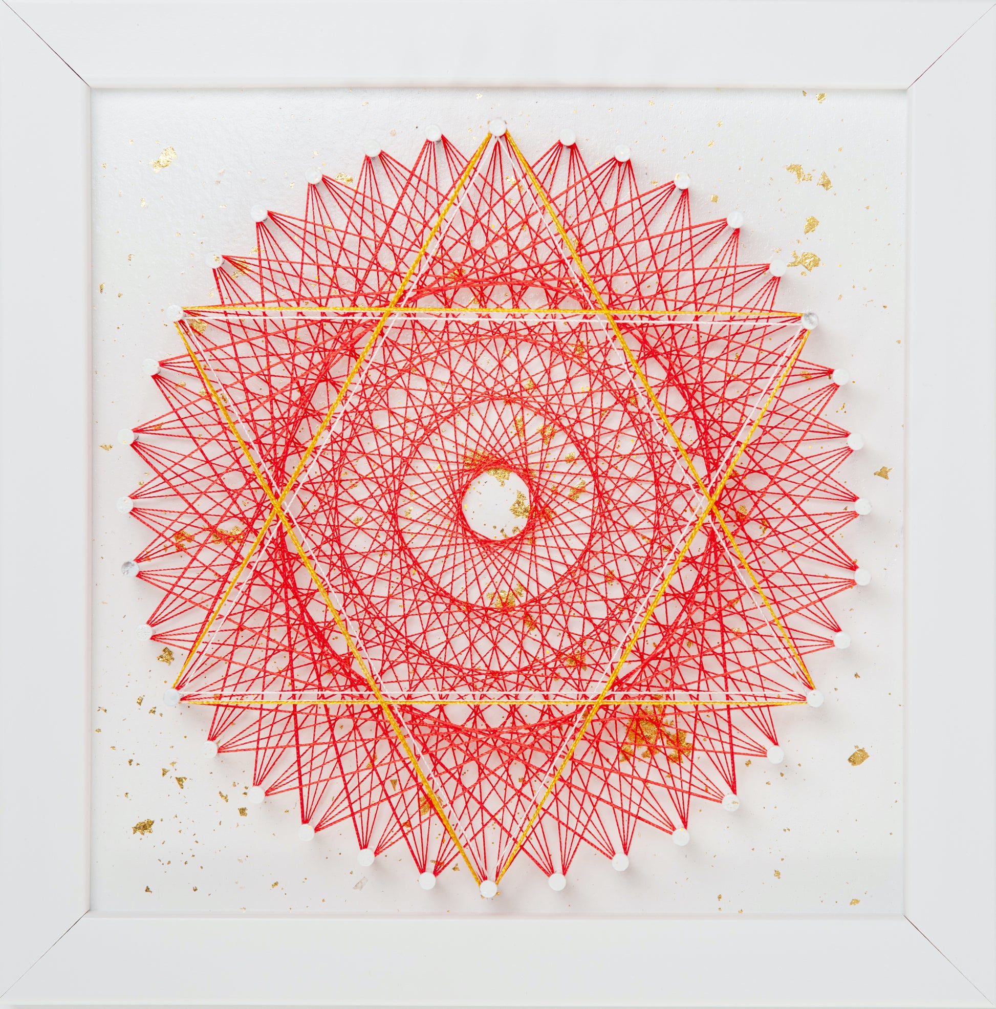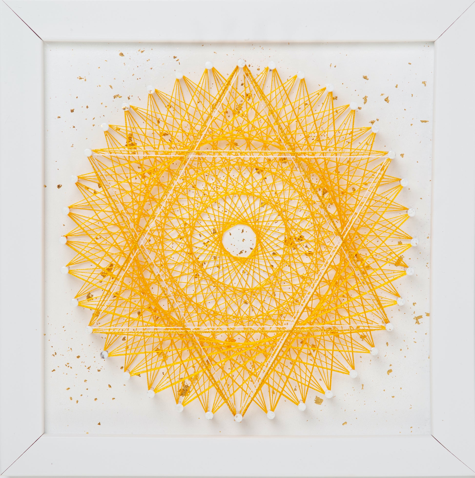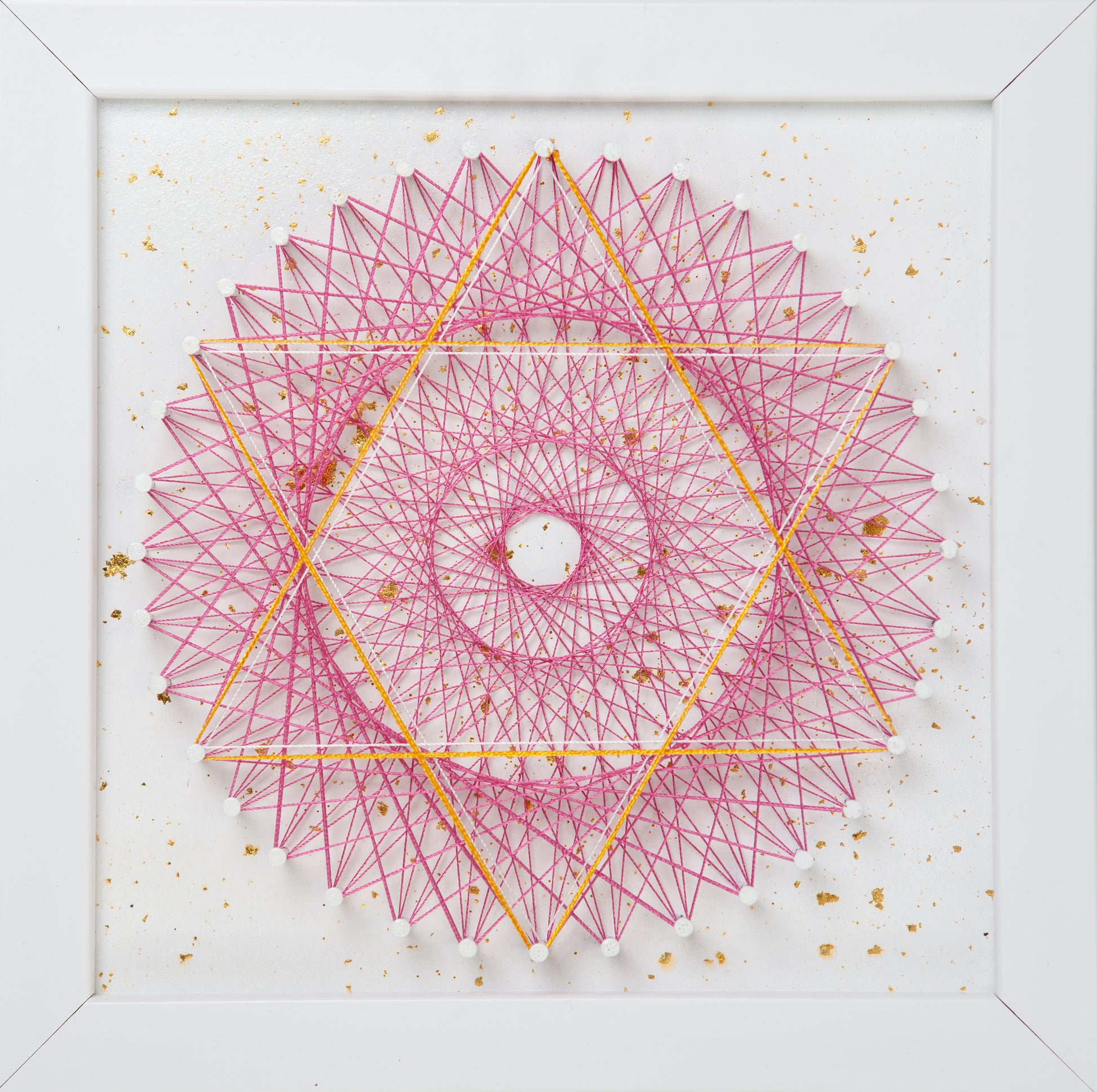 * Matériaux : clous, bois, fil de polyester résistant et brillant, feuille colorée - or, peinture graffiti, paillettes dorées, cadre en plastique blanc