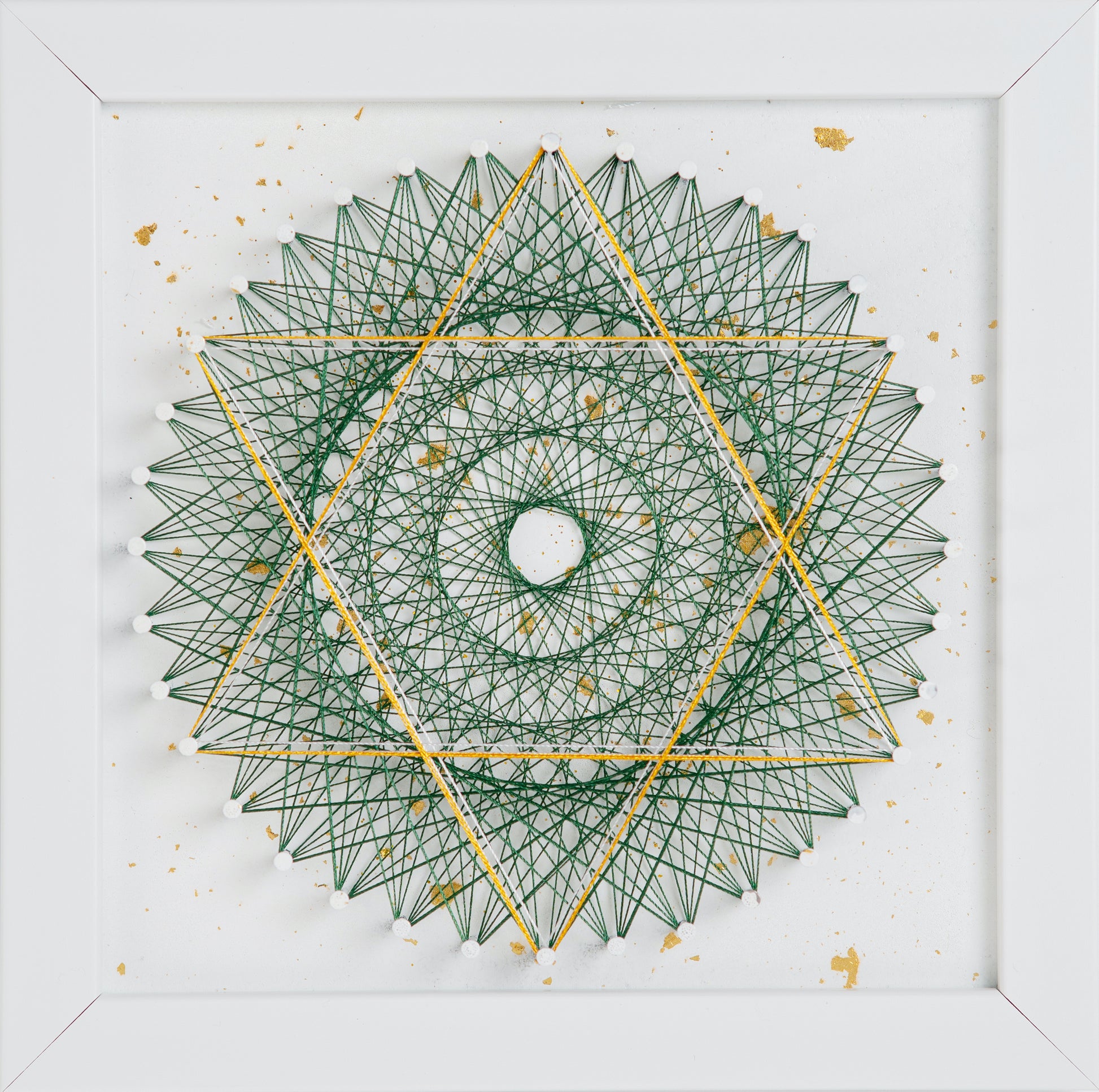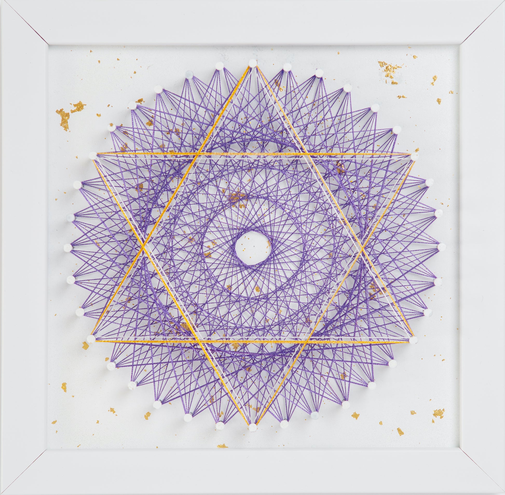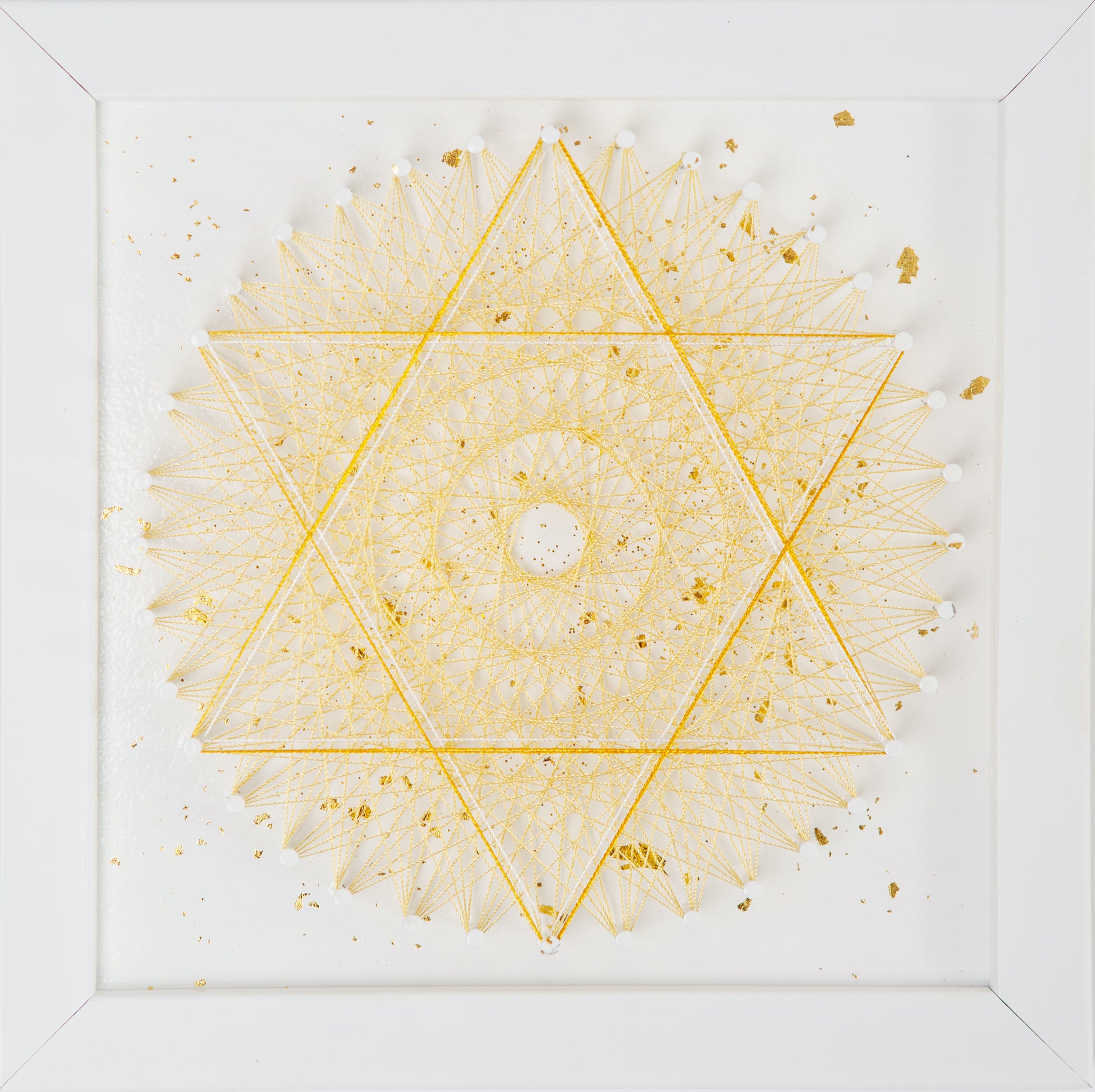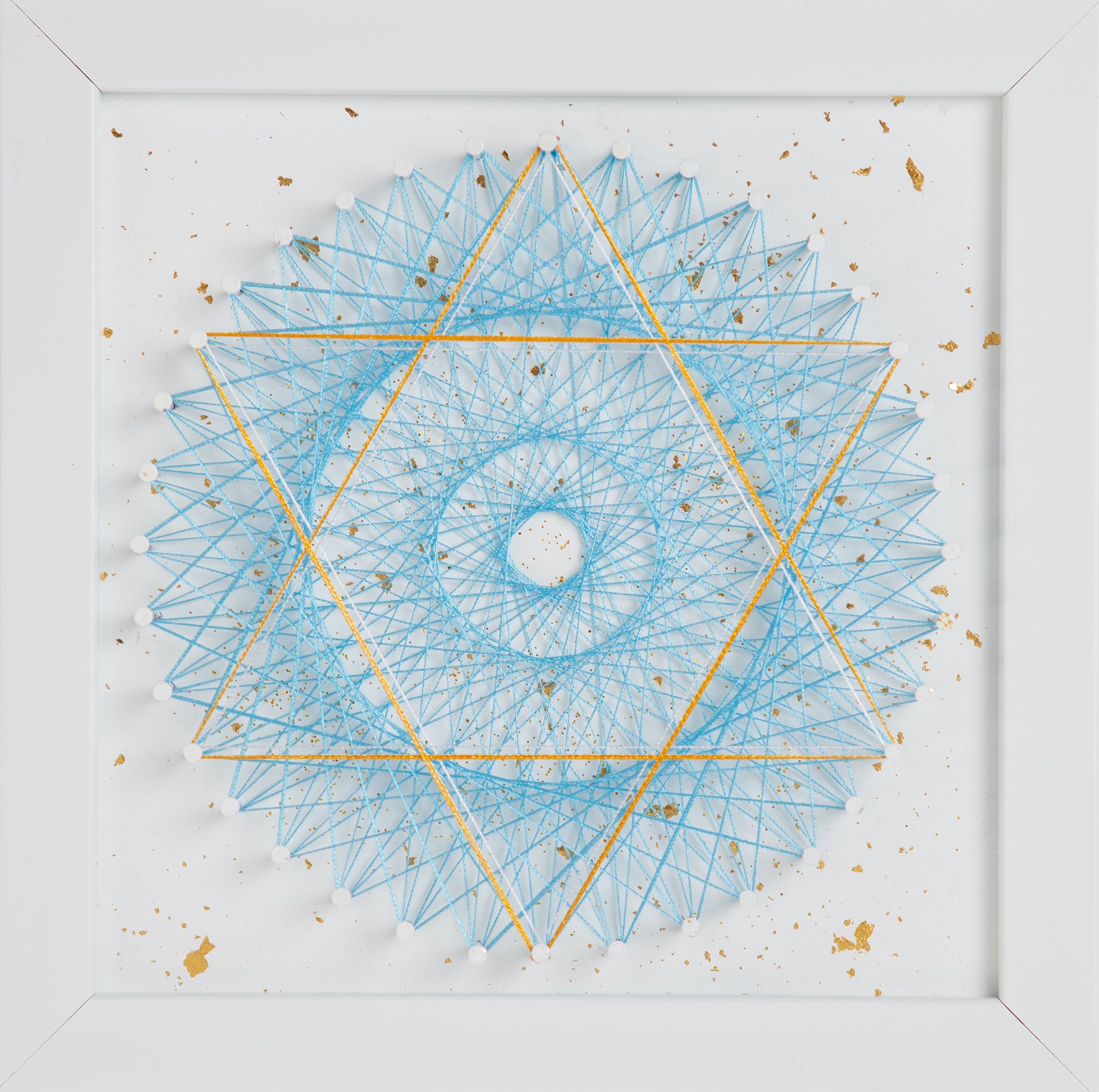 L'étoile de David , formée de deux triangles superposés, symbolise l' équilibre parfait entre le masculin et le féminin, entre le ciel et la terre, et dans le contexte du mandala composé de losanges avec un cercle central, cet équilibre devient une représentation profonde de la connexion entre les dimensions spirituelles et matérielles.